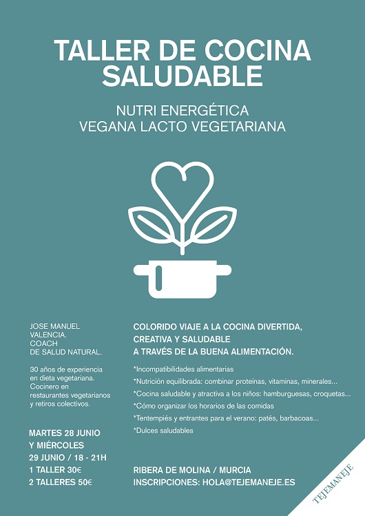 El martes 28 y miércoles 29 de junio, se impartirá en Tejemaneje un Taller de Cocina Saludable/Nutri Energética Vegana y Lacto Vegetariana.