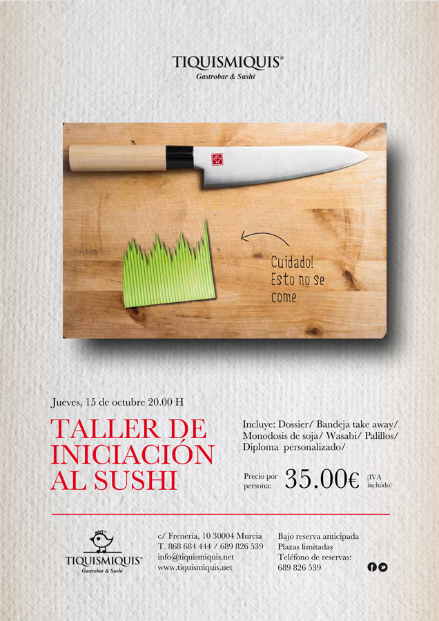 Si te gusta la cocina japonesa y quieres aprender a hacer Sushi, esta es tu oportunidad. Tiquismiquis Gastrobar & Sushi impartirá un taller de iniciación al sushi el Jueves 15 de Octubre.