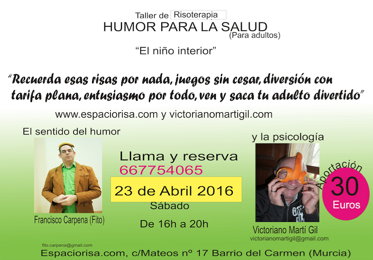 El próximo sábado 23 de abril, en Espaciorisa (Calle Mateos, 17) se va a realizar un taller de la risa dirigido al público adulto. El taller será impartido por Francisco Carpena (Fito), entrenador, dinamizador en sentido del humor y payaso de hospital y Victoriano Martí Gil, psicólogo, pedagogo y especialista en el crecimiento personal.