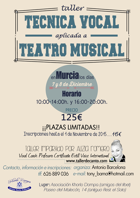 El taller lo impartirá Alizia Romero, Vocal Coach y profesora certificada del Estill Voice International. Par alas personas qeu vengan de fuera hay posibilidades de algunas habitaciones, desayunar, comer y cenar por precio especial.