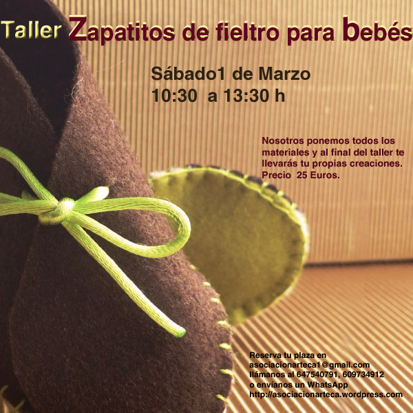El próximo sábado 1 de Marzo las compañeras de Mar en las alturas impartirán el taller ZAPATITOS DE FIELTRO PARA BEBÉS en la Asociación Arteca, en Murcia.