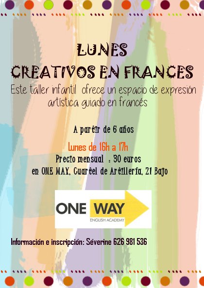 Crearemos juntos pero respetando el ritmo de cada niño y privilegiamos la libre expresión. El taller esta impartido por Séverine. Hizo una formación de arteterapia en Francia, en Murcia imparte clases de francés y talleres de artes plásticas.