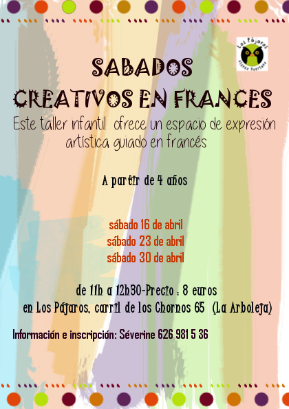 Crearemos juntos pero respetando el ritmo de cada niño y privilegiamos la libre expresión. El taller esta impartido por Séverine. Hizo una formación de arteterapia en Francia, en Murcia imparte clases de francés y talleres de artes plásticas.