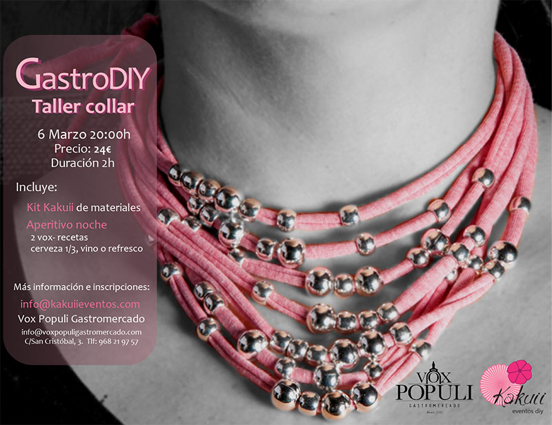 El próximo jueves 6 de marzo a las 20:00, os proponemos un taller en el que aprenderemos a diseñar nuestro propio collar para ir bien guapas esta primavera.