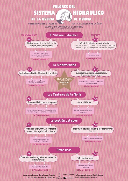 El próximo fin de semana del 27 y 28 de febrero junto a la Rueda de La Ñora tendrán lugar diversos talleres participativos y presentaciones organizados por Huerta Bizarra dirigidos por expertos que nos explicarán cómo funciona la estructura hidráulica de la huerta de Murcia y muchas de sus virtudes indirectas.