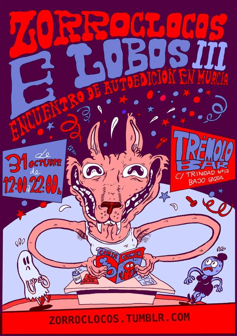 ¡Zorroclocos e Lobos, Encuentro de autoedición de la Región de Murcia, celebra su tercera entrega el 31 de octubre! Para esta ocasión, además de publicaciones autóctonas, contaremos con los alicantinos TDV, el valenciano Mr Awaka, el zaragozano Cómics y Cigarrillos y el madrileño Pin Up & Dinosaurs. Los participantes hemos preparado un fanzine colectivo de temática horrorosa y jalogüinesca que podrá adquirirse en el mercadillo por sólo UN EURO y que además servirá de boleto para la rifa de material autoeditado.